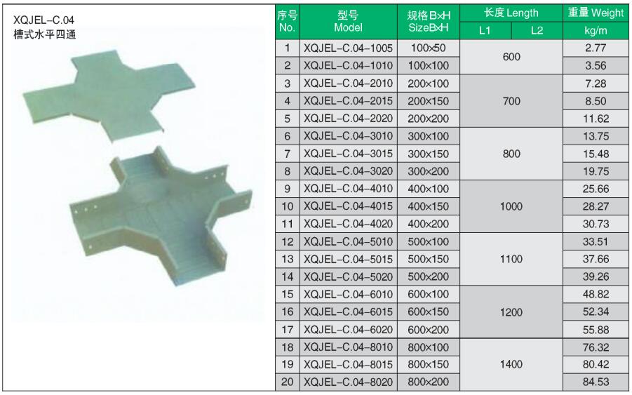 XQJEL_C.04槽式水平四通產(chǎn)品型號(hào)、規(guī)格、重量等參數(shù)及XQJEL_C槽式電纜橋架在不同跨距下允許均布載荷變形量。